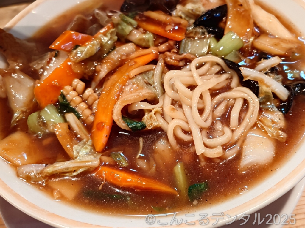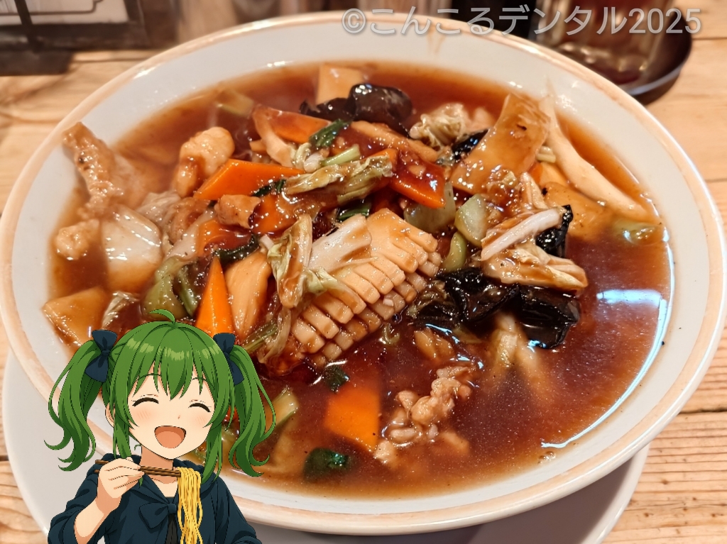万豚記 広東麺 2025.10.22 広東麺、どんぶりが変わって「おっ」と感じたのじゃ❗ 濃厚なとろみスープが、太めの麺にからんでじんわり幸せ……💫ただ、先月までは1,100円だったのが、今は1,280円に。 イカは一個減っておったが、そのぶん豚肉が厚みを増しておるのじゃ🐷✨しかもジューシーで存在感たっぷり。エビは三匹いたけど、かなり小ぶりになっておったのう🦐値上がりしたけど、この満足感なら仕方がないのう✨💫 あつあつの餡が麺を包み、野菜の甘みも引き立っておって、食べ終わるころには身体の芯までぽかぽかなのじゃ🍜💚