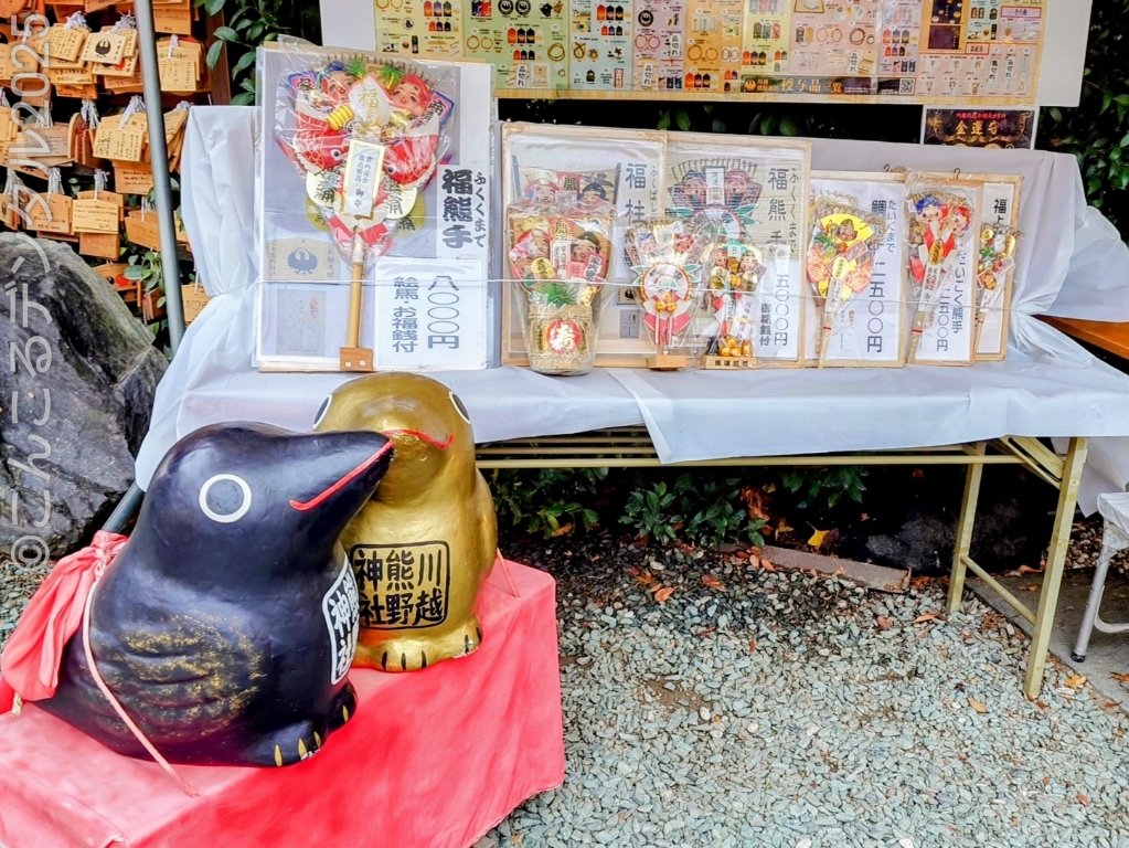 熊手やお守りが整然と並び、