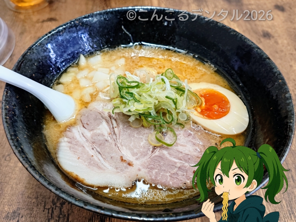 そして、ねぎの香りがふわり、チャーシューはしっとり、玉子も落ち着いた存在感で、全体が「濃厚」の一言に収まらんのじゃ🥓🥚
