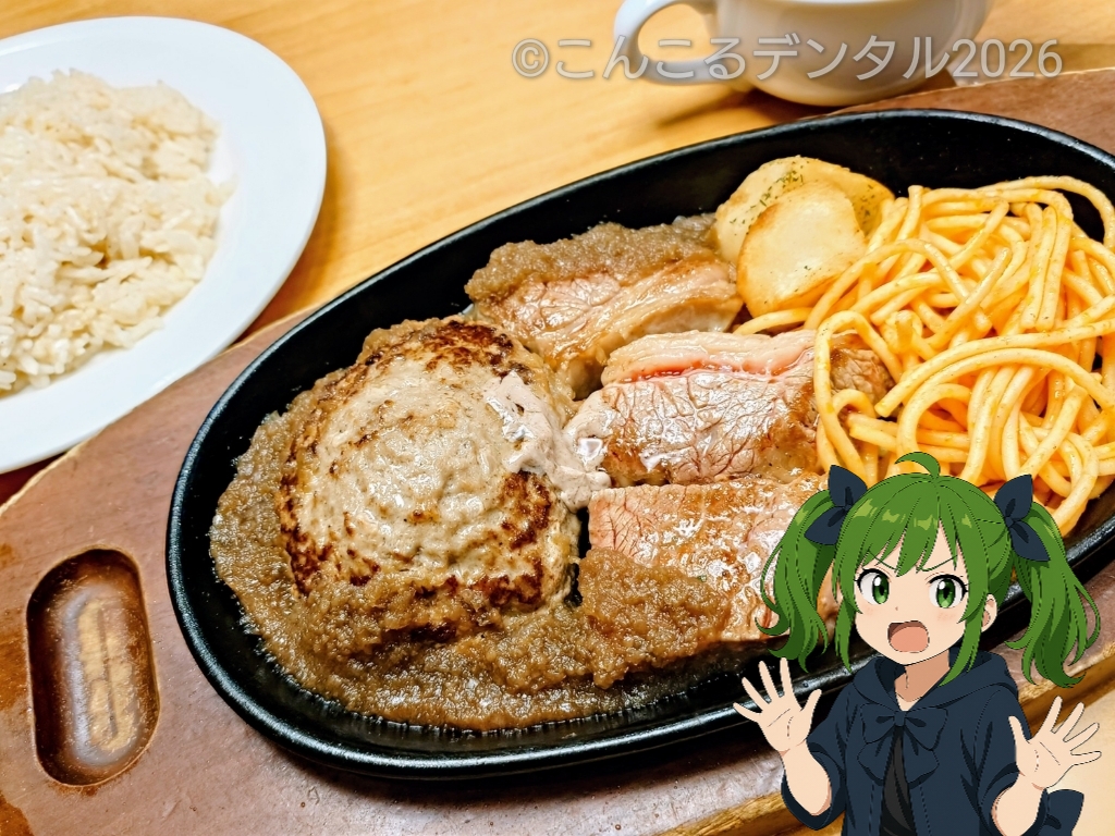 そして本日の主役、宮ハンバーグ120g&厚切りカットステーキ80g(1,749円)が運ばれてきたのじゃ🐂