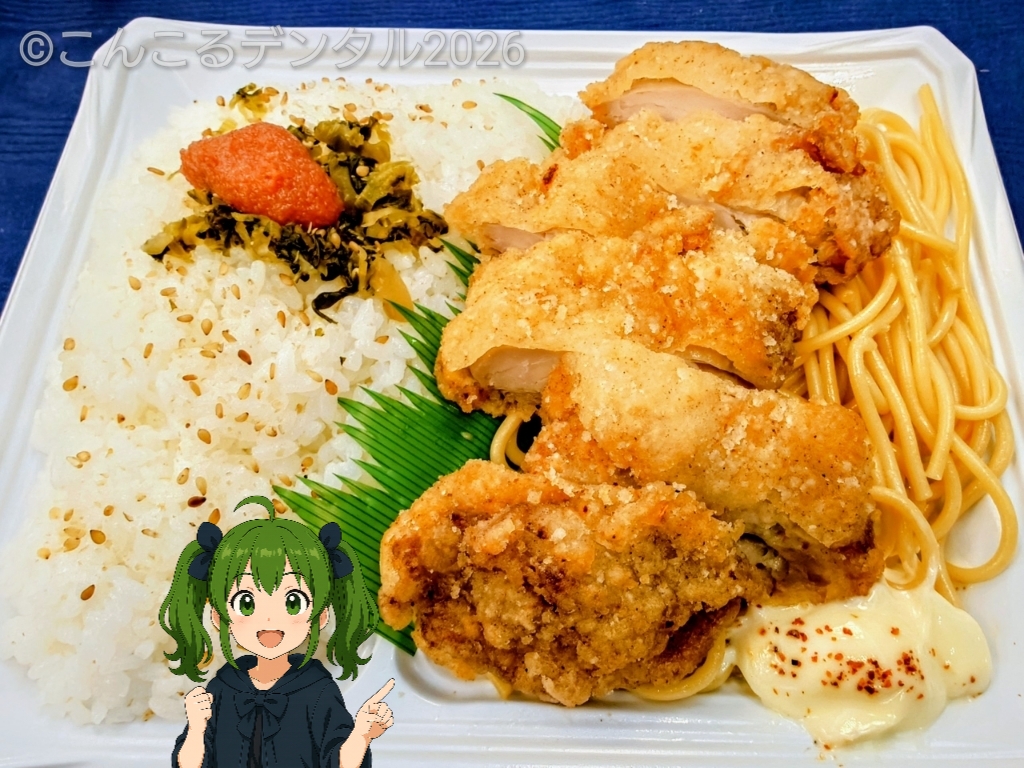 ふたを開けると、山賊焼がどーん。衣は香ばしく、見た目は「勝利の弁当」そのもの🍱